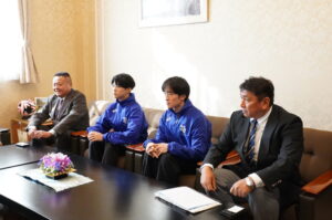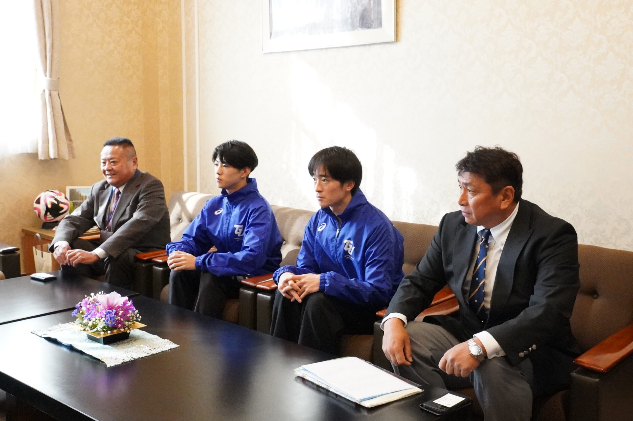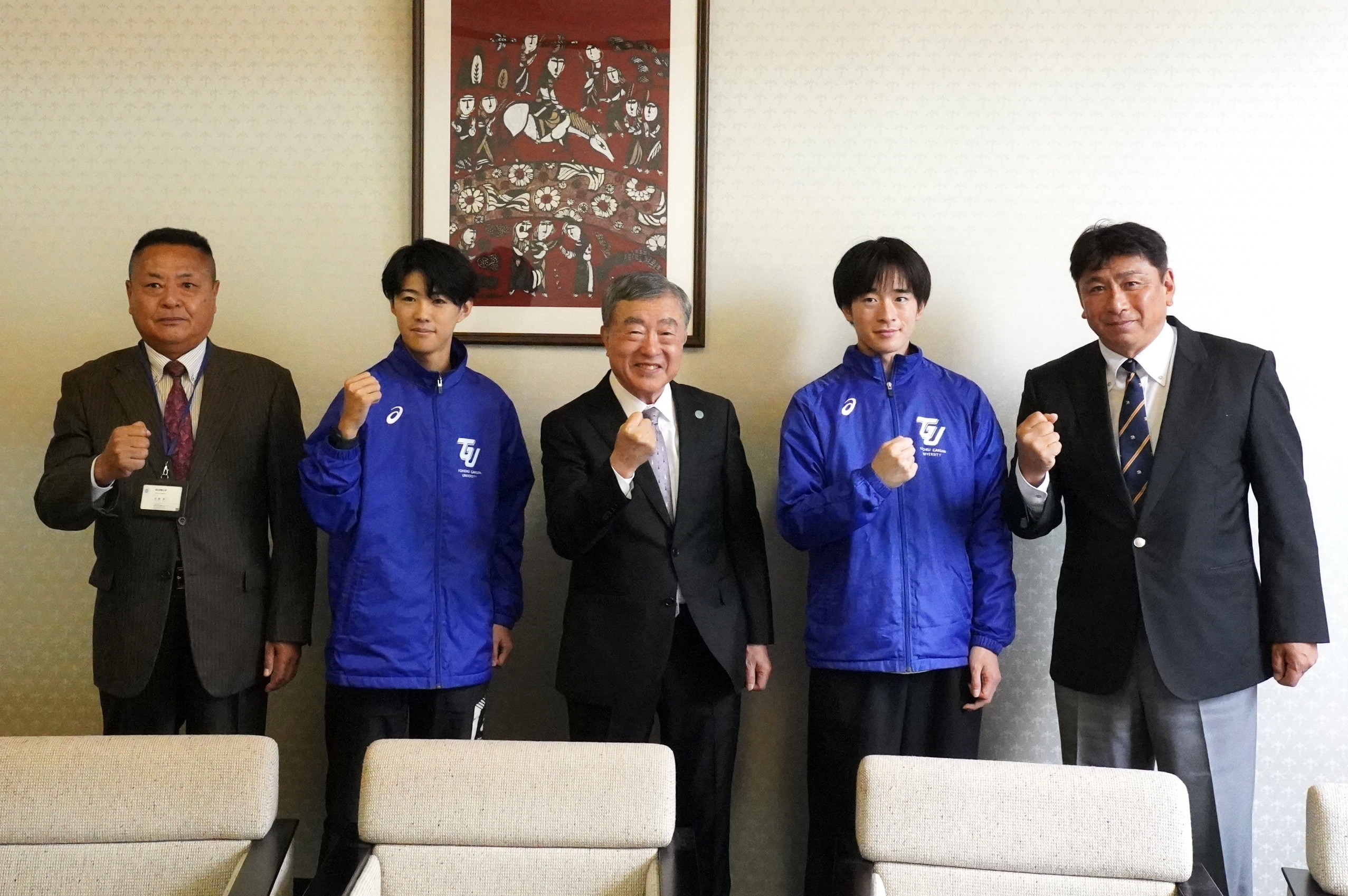 (左から高橋賢一監督、経済学科3年吉田泰斗君、心理行動科学科3年齋優太郎君、小川裕一スパーバイザー)