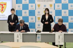 未来の扉センターにフェリス女学院大学の小檜山ルイ学長を迎えて、国内留学協定の締結式を挙行した。フェリス女学院は、1870年に開設された日本で最初の近代的女子教育機関であり、中高部門は有名な進学校、大学は60年前の開学であるが、英語や音楽や国際交流に実績を残してきた横浜の女子大学である。小檜山学長から国際留学の申し出があり、協定締結の運びとなった。