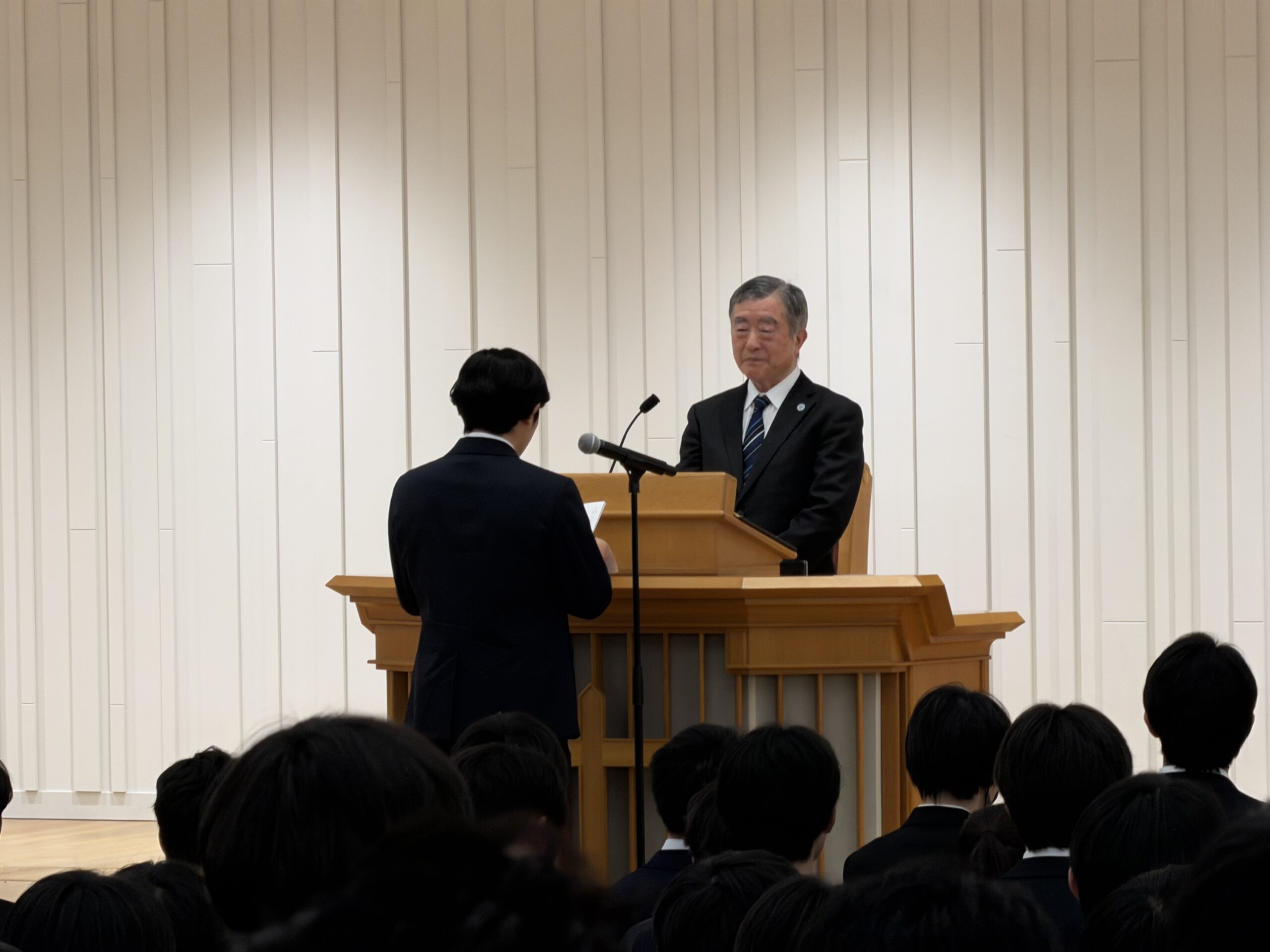 すでに3年間、あるいは中学からの6年間、キリスト教教育を受けてきた皆さんは、土樋・五橋の都心型キャンパスにおいて中心的役割を果たすことが期待されています。学業に励み、課外活動に参加し、大学礼拝に出席してほしいのです。公立をはじめ他の高校から入学してきた新入生たちは、皆さんの立ち振る舞いを観て、東北学院がどのような学校なのかを判断するでしょう。その意味で、皆さんは「東北学院を映し出す鏡」なのです。建学の精神であるキリスト教の精神を身につけている学生とは、愛をもって隣人に接することができる人であり、自らの目標に向かって未来への希望をもって勉学に励むことのできる人のことです。すでにキャンパスの中心にいる存在として、東北学院大学での学生生活をスタートさせてもらいたいと期待しています。
